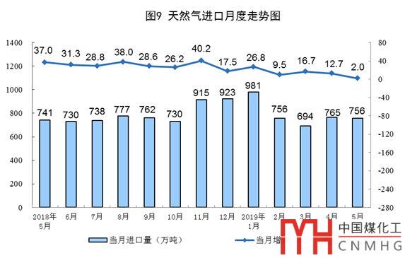 5月份,進口天然氣756萬噸,同比增長2.0%,增速較上月回落10.7個百分點;1—5月份,進口天然氣3943萬噸,同比增長13.4%。