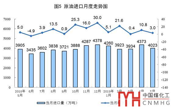 5月份,進口原油4023萬噸,同比增長3.0%,增速較上月回落7.8個百分點;1—5月份,進口原油20513萬噸,同比增長7.7%。