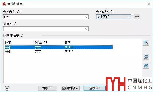 曾有網(wǎng)友問:圖中有一些帶E的文字,類似E、2F-E-1、2F-E-2,想將E替換成其他字符,但不希望替換2F-E-1和2F-E-2中的E,但CAD的查找功能會(huì)將所有帶E的文字都搜索出來,如果想單獨(dú)替換,只能查看搜索結(jié)果,然后一個(gè)個(gè)去替換,或者先統(tǒng)一替換,然后再將前面帶2F-的文字替換回來。