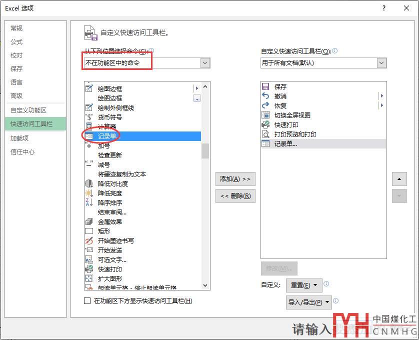 打開Excel選項-快速訪問工具欄-從不在功能區(qū)中的命令找到記錄單,添加至用于所有文檔(默認)