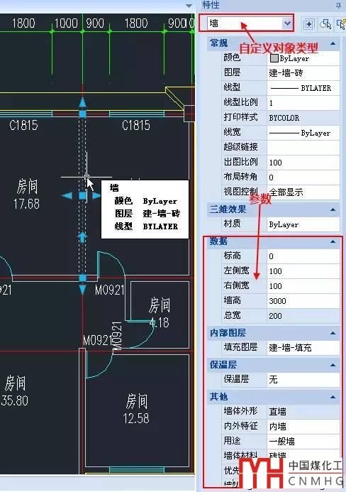 國內比較常用的天正建筑、浩辰建筑等都使用了自定義對象的技術,這些專業(yè)軟件中的墻體、門窗,甚至標注、符號等都采用了自定義對象。以浩辰建筑的墻體為例,下圖是選中墻體后夾點和特性的顯示。