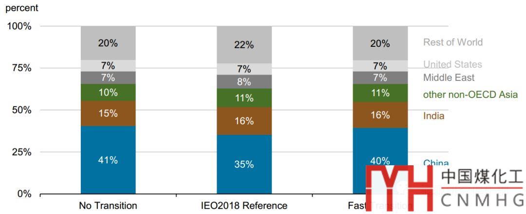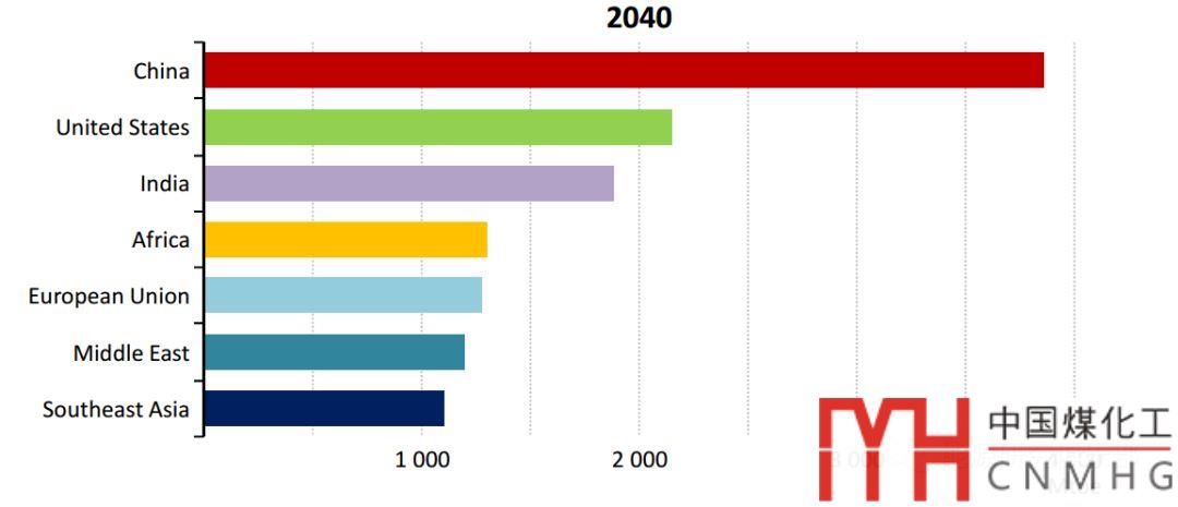 按裝機容量計算,到2040年,中國、美國、印度將成為全球最大的能源消費國。世界主要地區(qū)能源消費占比情況將完全逆轉(zhuǎn)(見圖4)。