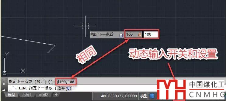 因?yàn)槟J(rèn)是極坐標(biāo),當(dāng)拖動(dòng)光標(biāo)的時(shí)候,動(dòng)態(tài)輸入就會(huì)顯示光標(biāo)距離上一點(diǎn)的距離和角度,當(dāng)要輸入XY坐標(biāo)時(shí),仍按X,Y的方式輸入,輸入,號(hào)后,就可以輸入Y坐標(biāo)。當(dāng)要輸入相對(duì)長(zhǎng)度和角度時(shí),輸入距離后,可以按常規(guī)輸入<切換為角度,也可以按TAB鍵切換到角度輸入框。