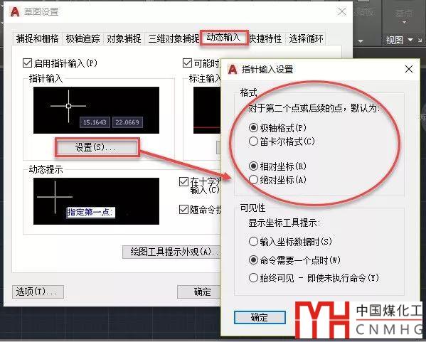 動(dòng)態(tài)輸入默認(rèn)使用相對(duì)坐標(biāo),而且是極坐標(biāo)(距離+角度),這些都可以右鍵單擊動(dòng)態(tài)輸入按鈕后在動(dòng)態(tài)輸入對(duì)話框中設(shè)置,如下圖所示。