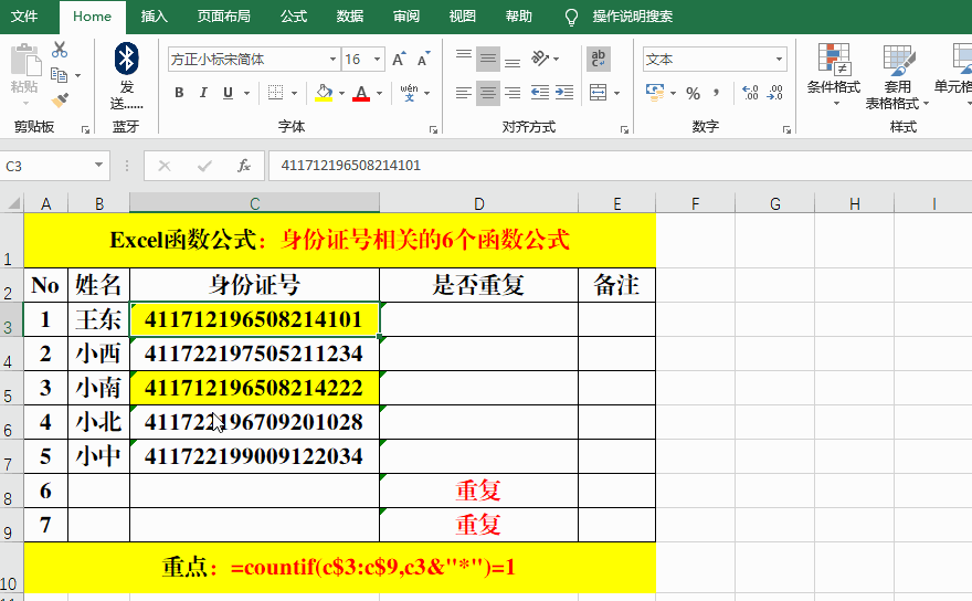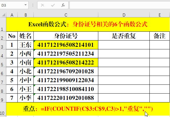 五、If+Countif:判斷身份證號(hào)碼是否重復(fù)。