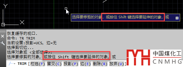 文章的題目是修剪和延伸的使用技巧,但上面將的都是修剪,其實修剪和延伸是兩個關(guān)聯(lián)的命令,在使用修剪的時候,如果按住SHIFT鍵,就可以進(jìn)行延伸,反過來也一樣,延伸的時候按住SHIFT鍵就可以修剪。當(dāng)我們的圖形既需要修剪又需要延伸的時候,只要執(zhí)行一個命令就可以了,不用退出后再執(zhí)行另一個命令。這一點在命令行或動態(tài)輸入都有明確的提示,不知道大家注意沒有,如下圖所示。