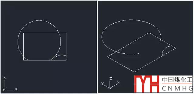 為了說明不同投影方式的效果,我們通過一張簡單的例圖來看一下效果。為了讓大家看得清楚,設(shè)置了兩個視口,一個是俯視圖,一個是軸測視圖,我們將用矩形修剪兩個圓,通過看兩個視圖能清楚看到修剪后的狀態(tài)。
