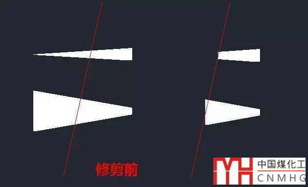 如果要修剪兩條相隔比較近的線中間的圖形,尤其邊界線傾斜的時候,如下圖中要修剪兩條紅線之間的白線,用F就方便了,輸入F后,拉一條斜線,就中間的線全部修剪掉了。