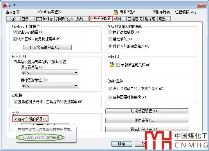 在選項OP對話框的“用戶系統(tǒng)配置”選項卡中就可以取消“顯示字段的背景”,如下圖所示。