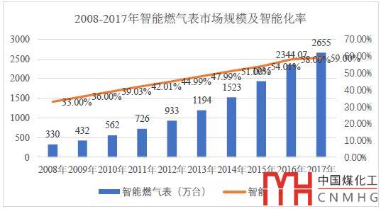 2017年,我國燃氣表市場銷量4,500萬臺,智能燃氣表市場銷量2,655萬臺;2008-2017年國內燃氣表復合增長率18.19%,智能燃氣表復合增長率為26.07%。預計到2022年,燃氣表市場銷量將達到6,000萬臺左右,其中物聯(lián)網智能燃氣表的市場銷量將達到1,400萬臺左右。