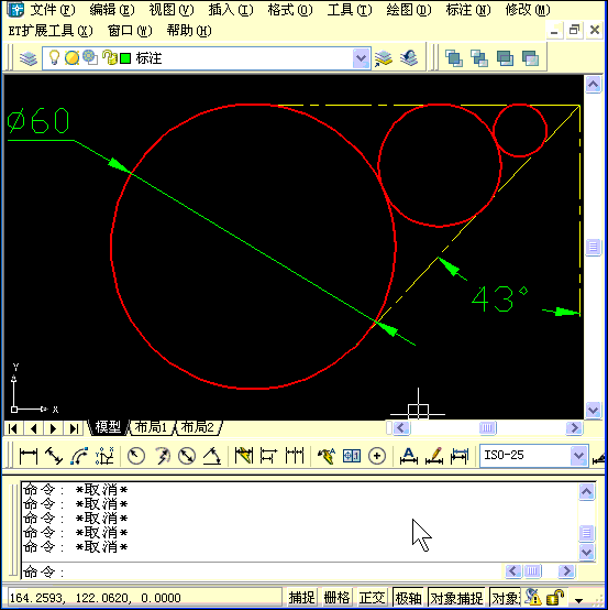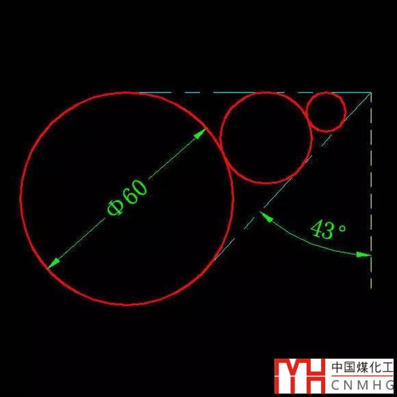 這張圖給出的條件不多,但已經(jīng)足夠了,畫好兩條公切線后,利用利用相切相切半徑(TTR)方式畫出直徑60的圓,然后利用相切相切相切畫出另外兩個圓就行了。