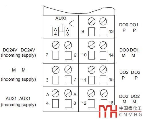要注意的是,如果使用通道2(DO2)且負(fù)載的電流很大,需要將11,15并聯(lián),同時將12,16并聯(lián),以防止電流過大造成端子發(fā)熱。
