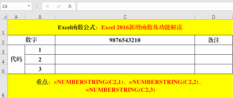 在目標單元格中輸入公式:=NUMBERSTRING(C2,1)、=NUMBERSTRING(C2,2)、=NUMBERSTRING(C2,3)。