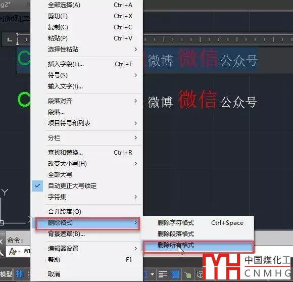 如果已經(jīng)遇到了上述問題后,我們希望多行文字的一行分解成一個(gè)單行文字怎么辦呢?首先我們要保證我們的文字樣式支持中文,然后可以進(jìn)入多行文字,選中所有文字,然后右鍵,選擇“刪除格式”》“刪除所有格式”,如下圖所示。