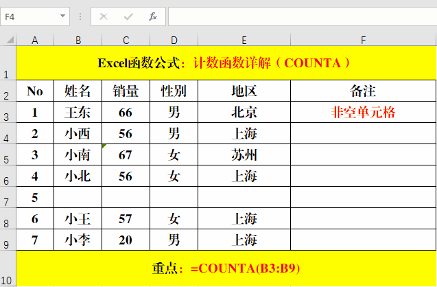 1、B3:B9共有7個(gè)單元格,但是B7單元格為空,暨非空單元格有6個(gè)。
