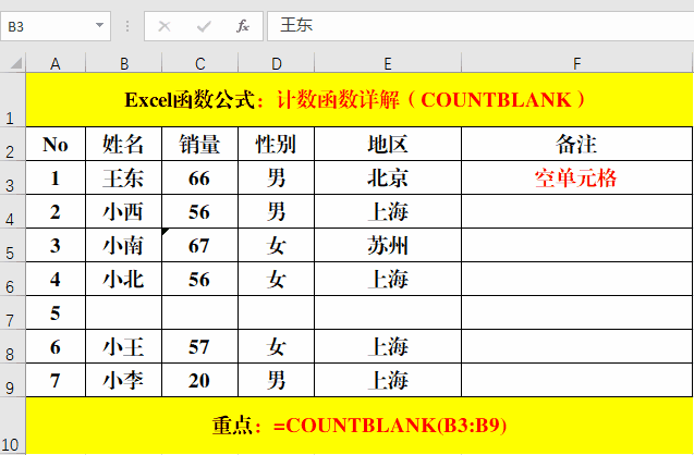 在目標(biāo)單元格中輸入公式:=COUNTBLANK(B3:B9)。