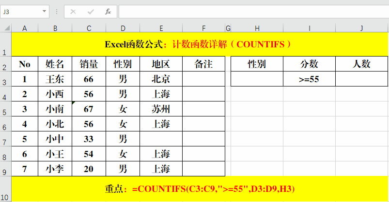 在目標(biāo)單元格中輸入公式:=COUNTIFS(C3:C9,">=55",D3:D9,H3)。