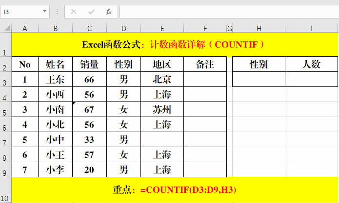 在目標(biāo)單元格中輸入公式:=COUNTIF(D3:D9,H3)。