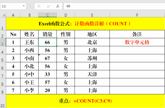 在目標(biāo)單元格中輸入公式:=COUNT(C3:C9)。