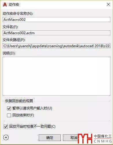 2、在菜單里選擇或在面板中單擊“停止”按鈕,或者直接輸入ACTSTOP命令,可以結(jié)束動作錄制,此時會彈出一個“動作宏”對話框,在此對話框中可以將記錄的動作保存成一個宏文件,如下圖所示。