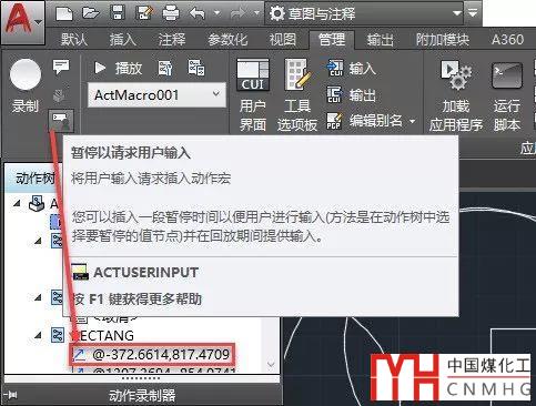 選擇動作宏文件或命令時,可以插入基點,選擇任意一個節(jié)點都可以插入消息,選擇坐標(biāo)值時可以加暫停等待輸入,如下圖所示。