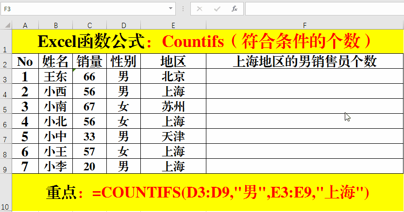 在目標(biāo)單元格中輸入公式:=COUNTIFS(D3:D9,"男",E3:E9,"上海")。