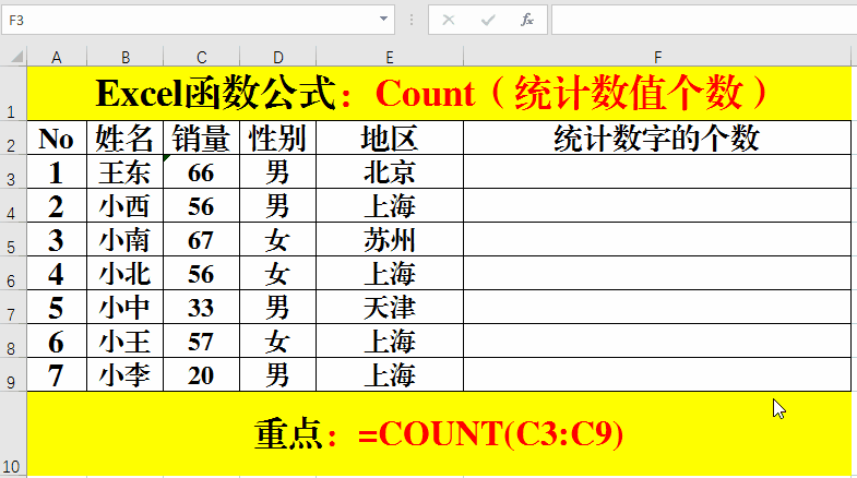 在目標(biāo)單元格中輸入公式:=COUNT(C3:C9)。