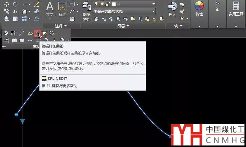 選中一條樣條線后,執(zhí)行樣條線編輯SPLINEDIT命令,可直接輸入命令,也可以在菜單中選擇:修改>對象>樣條曲線或在修改面板選擇此命令,如下圖所示。
