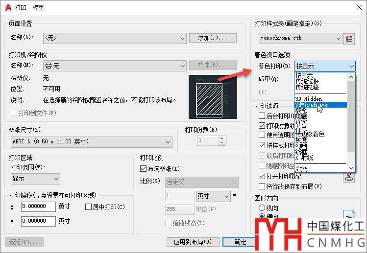 如果在模型空間,你可以不用設(shè)置著色模式,只需要到打印對(duì)話框里設(shè)置著色打印選項(xiàng)就好了,如下圖所示。