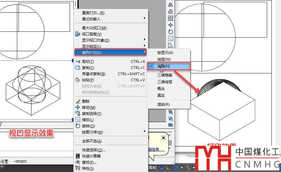 要將模型空間和布局視口內(nèi)打印著色或消隱等效果,只需要輸入HIDE消隱、SHADE著色、VS(VSCURRENT或SHADEMODE)著色模式來設(shè)置著色效果,如下圖所示。