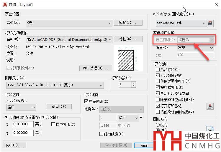 如果在打印對(duì)話框中將著色打印選項(xiàng)設(shè)置為“按顯示”即可,如果在布局空間打開打印對(duì)話框,這個(gè)選項(xiàng)默認(rèn)就是“按顯示”,而且是不可以修改的,如下圖所示。