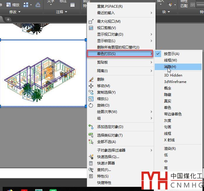 其實(shí)視口可以不用按照顯示的著色模式去打印,選擇視口后可以直接在右鍵菜單中設(shè)置著色打印選項(xiàng),如下圖所示。