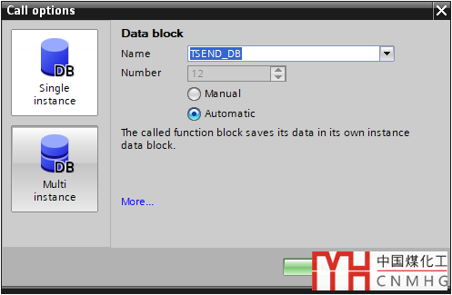 將其拖拽到程序塊中,系統(tǒng)會自動提示添加背景數(shù)據(jù)塊(Instance DB)??梢赃x擇獨立背景數(shù)據(jù)塊(Single Instance DB)或者多重背景數(shù)據(jù)塊(Mutil instance DB),也可以修改DB塊的名稱。這里,我們使用獨立背景數(shù)據(jù)塊,采用默認的名稱“TSEND_DB”,如下圖: