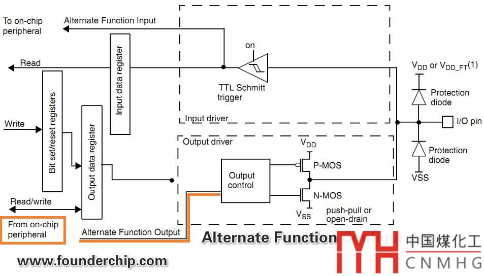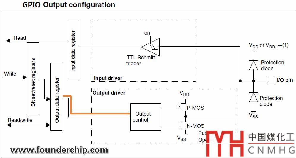 下面這張圖,是普通GPIO輸出的引腳配置圖,可以看到其輸出信號來自輸出數(shù)據(jù)寄存器(Output data register):