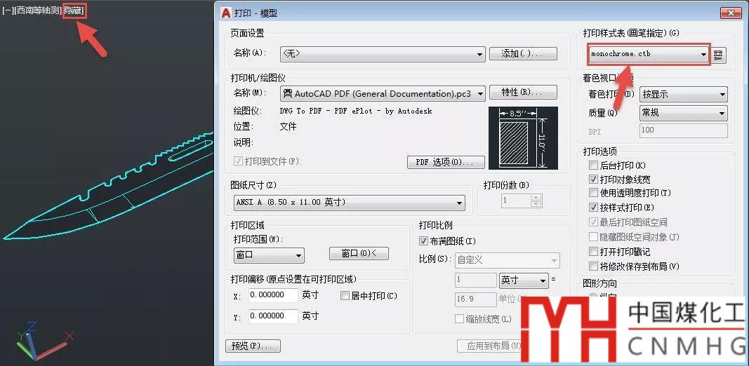 今天有網(wǎng)友在群里問了這個問題,CAD的三維模型將視覺樣式設(shè)置為隱藏,然后打印樣式表的輸出顏色設(shè)置成黑白(MONOCHROME.CTB)以后,打印出來圖形還是彩色的,問是什么原因,能不能打印成黑白的效果。我試了一下,確實(shí)如此。消隱和打印設(shè)置如下圖所示。