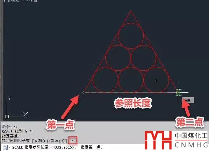 4、輸入SC,回車,框選三角形和圓后回車,指定到三角形底邊的一個(gè)頂點(diǎn)為基點(diǎn),輸入R,回車,命令行會(huì)提示指定參照長度,我們并不知道現(xiàn)在三角形底邊的長度,因此需要通過捕捉底邊的兩個(gè)點(diǎn)來確定參照長度,如下圖所示。