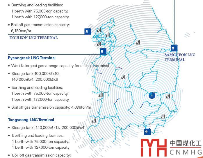 由于國內(nèi)巨大的天然氣發(fā)電、工業(yè)及城市燃氣的需要,為了保證天然氣穩(wěn)定進口和供應(yīng),KOGAS在韓國建設(shè)了4座LNG接收站,共計72個LNG儲罐,總?cè)莘e達到1147萬方。