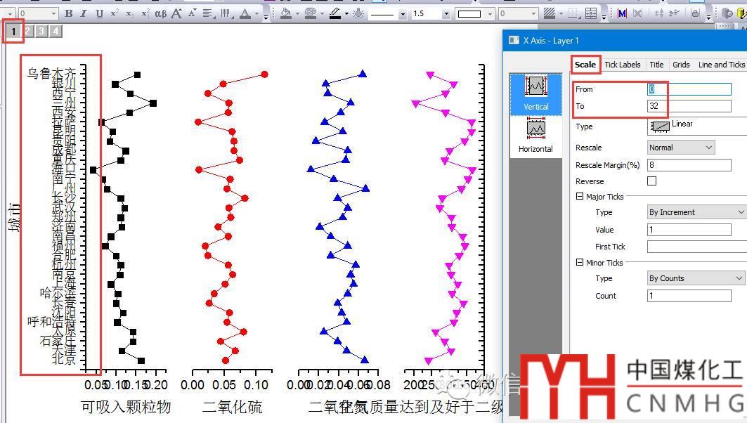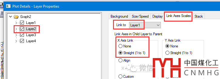 調整圖層1左側坐標軸的范圍為0~32,其他圖層會自動調整,因為前面已經將圖層2-4鏈接到圖層1,其X軸的范圍設置為Straight (1 to 1)
