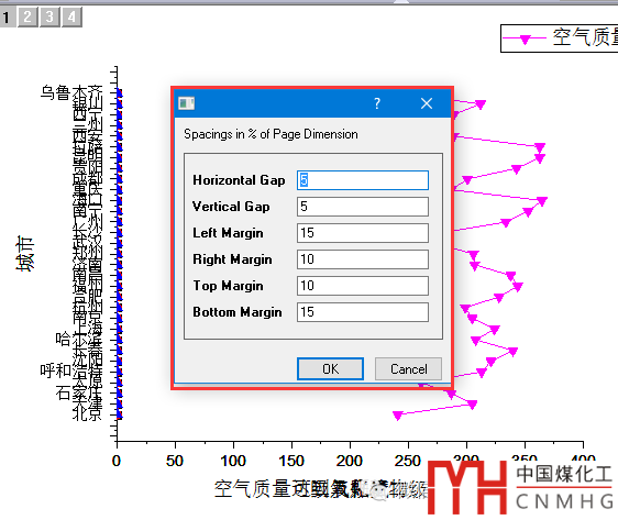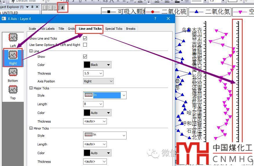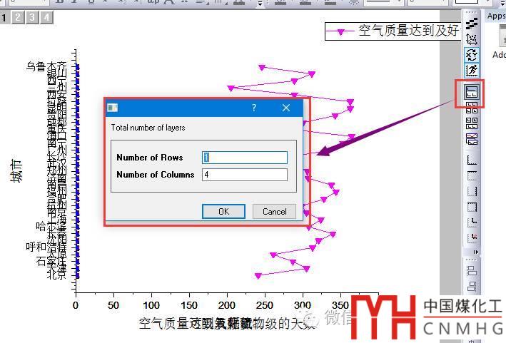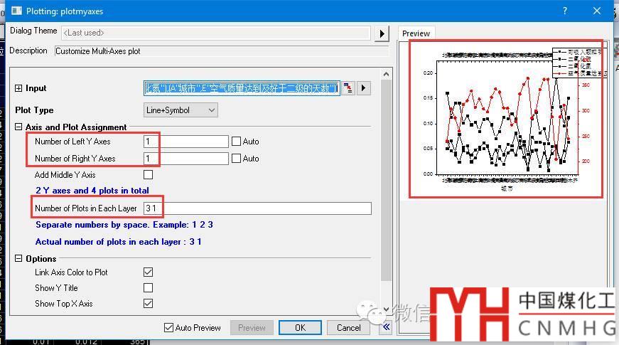 【關鍵步驟】在設置對話框中,左右Y軸個數(shù)均為1(Double-Y),Number of Plots in Each Layer設置為“3 1”(中間為空格)!