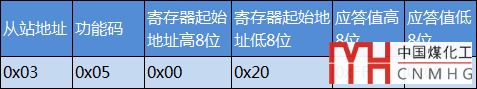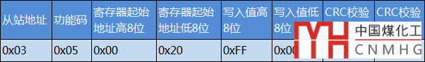 假設(shè)要將從站地址0x03的第33個線圈(地址:0x0020)的值設(shè)置ON,指令如下圖所示: