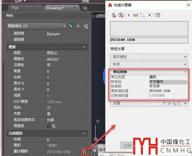 在特性面板中看到面積值后,還可以單擊累積面積后的計(jì)算器按鈕進(jìn)行單位轉(zhuǎn)換,如下圖所示。