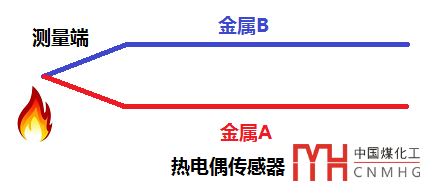 熱電偶(thermocouple)是把兩種不同材料的金屬的一端連接起來,利用熱電效應來測量溫度的傳感器。如下圖: