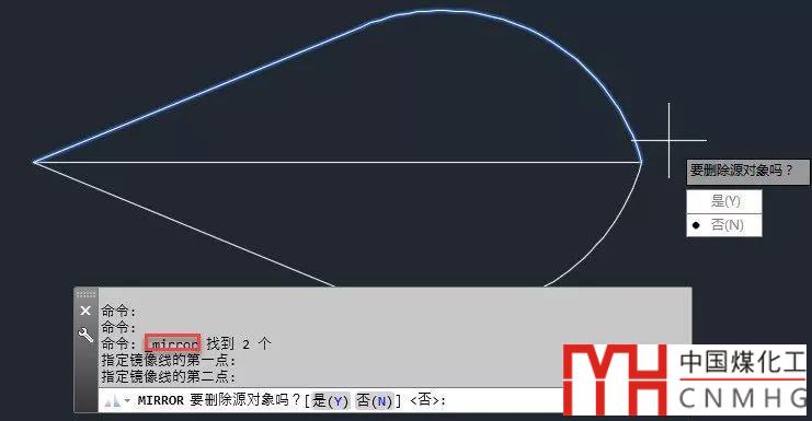 6、輸入MI回車,執(zhí)行鏡像命令,選擇斜線和圓弧,鏡像軸選擇水平線的,將上方的圖形鏡像一份,如下圖所示。
