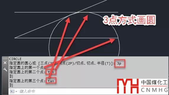 4、執(zhí)行3點(diǎn)畫圓的命令,先捕捉長度100直線的右側(cè)的端點(diǎn),然后依次輸入TAN回車,捕捉與上方直線和斜線的切點(diǎn),如下圖所示。