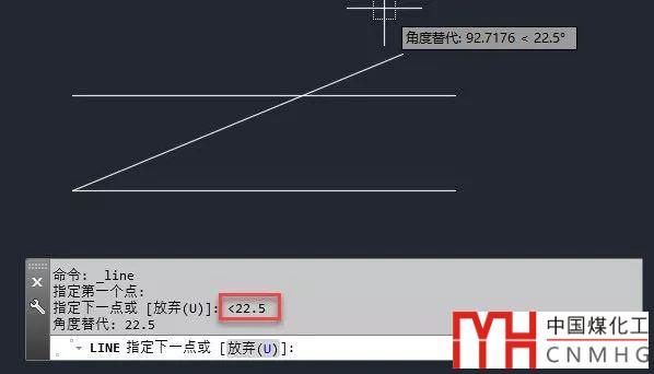 3、輸入L,回車,捕捉直線左側(cè)的端點(diǎn)為第一點(diǎn),輸入<22.5,回車,先確定角度,然后拖動(dòng)光標(biāo),在上面水平線的上方單擊完成直線繪制,如下圖所示。