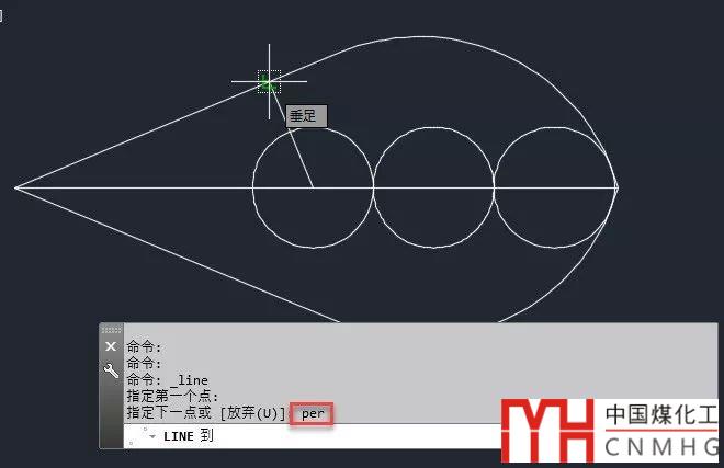 9、輸入L,回車,第一點(diǎn)捕捉左側(cè)圓的圓心,輸入PER,回車,捕捉與上方斜線的垂點(diǎn),如下圖所示。