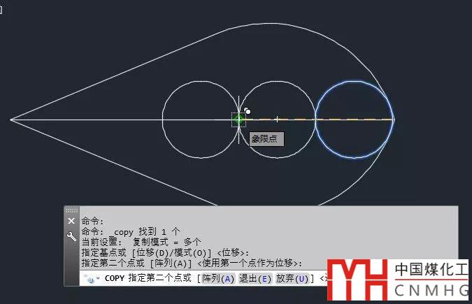 8、打開象限點(diǎn)捕捉,復(fù)制CO圓,以右側(cè)象限點(diǎn)為基點(diǎn),左側(cè)象限點(diǎn)為目標(biāo)點(diǎn),復(fù)制一個(gè)圓,然后再以新圓的左側(cè)象限點(diǎn)為目標(biāo)點(diǎn)復(fù)制第二個(gè)圓,然后回車結(jié)束復(fù)制,如下圖所示。