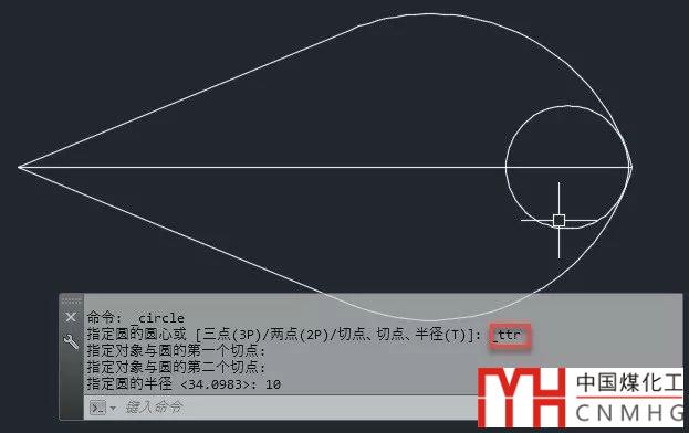 7、線用相切相切半徑畫圓的方法畫一個(gè)小圓,再上下兩端圓弧分別取一個(gè)切點(diǎn),半徑可以輸入10,如下圖所示。