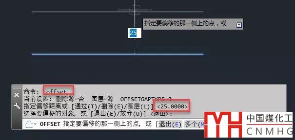 2、輸入O命令,回車,偏移距離輸入25,選擇直線,向上偏移一條直線,如下圖所示。