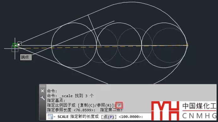 11、輸入SC,回車,啟動(dòng)縮放命令,選擇三個(gè)圓后回車,基點(diǎn)選擇水平直線右側(cè)的端點(diǎn),輸入R,回車,采用參照模式。提示指定參照長度的時(shí)候,第一點(diǎn)捕捉直線右側(cè)的端點(diǎn),第二點(diǎn)捕捉上一步繪制的輔助線與水平直線的交點(diǎn),提示指定新長度的時(shí)候,可以直接輸入100或捕捉水平直線左側(cè)的端點(diǎn),如下圖所示。